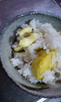 秋の味覚・・・栗さん。先日ご近所さんからイガイガ付の栗をたくさんいただきました。一晩お水につけておいて翌日、夜にごろっごろの栗ごはんになって登場。ほくほくでおいしかったね。