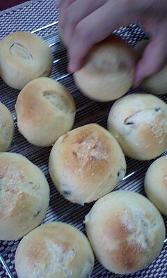 さてさて・・・ひといきついたので?お昼の続きといきましょうか。初めての全粒粉のパンもうまく発酵してふんわりふ~っくらと膨らみましたよ・・・・・・・・・・・・・・・・・・5cm~8cmくらいの少し小さめサイズ。プチパンに仕上げたのでチビたんもお昼寝から起きて2個半ペロリとたいらげました。手に持っている方が全粒粉入りのシンプルパン。手前のはカシューナッツとレーズンを入れてちょっぴりグラニュー糖をかけてこちらもシンプルに焼きました。どちらも少しバターを控えめに・・・。ふんわりモチモチ焼きたてはやっぱりおいしいねぇ~。・・・・・・・・・・・・・・・・・・パパ、今度はクッペパンが食べたいとのこと・・・はて・・・???粉の割合はどうすればいいのかしら?・・・・・・・・・・・・・・・・・・『自家製酵母パン』の本私の持っているこの本にクッペのレシピが載っているのだけれど・・・。やっぱり自家製酵母に再チェレンジしようかな~。(初めての自家製酵母は残念ながら失敗)今度はcuocaでレーズン買おうかな~