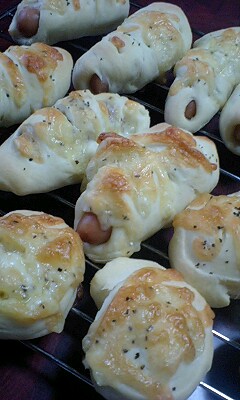 私の住む町は・・・今日は朝からずーーーっと雨。しかもちょっと風も強くて。こんな時はさすがにお外にはいけないのでまたもやパンを焼くことに~。・・・ってゆーか最近 食べ物ネタばかりだわっ。・・・・・・・・・・・・・・・・・・・ウィンナーのパンがいいィ~・・・っと チビたんのリクエストで今日はソーセージ入りのものを作りました。上からチーズとブラックペッパーをトッピング。発酵するまでの間、ふたりで“ぞうきん”片手にあちこちお掃除して模様替えをしたり、引き出しの中をキレイにしたりチビたんも大張り切り・・・で。焼き上がりはこんな感じ。ソーセージ入りと手前は少しチーズを入れてロールにして~プチパンサイズに上からもチーズをたっぷりと。結局このパン、チビたん合計3個半“も”食べましたよ~。ほんとよく食べるわ