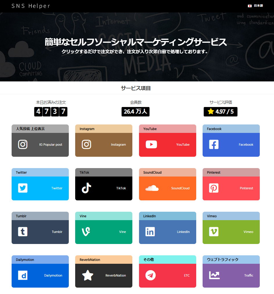 Twitterのフォロワー数が気になりますよね。地道にツイート数を増やすべきなのでしょうが、SNSヘルパーとのサービスを見つけてしましました。これで「ツイッターフォロワー増やす」ことが出来そうです。以前 Facebook にて有名人に友達依頼を申し込んだら、OKとなったことがありました。有名人と友達になった瞬間から、Facebook が非常に忙しく動きだしました。ちょっとしたきっかけで、ずいぶん変わるものだと思います。このSNSヘルパーも「ツイッターフォロワー増やす」きっかけになればうれしいです。SNSヘルパーとはお金でポイントを買い、そのポイントでフォロワーを増やすことのできるサービスです。FacebookYouTubeTwitterTumblrTikTok ほかなど多数のサービスに対応しています。提供されるサービスは安全ですか?--------- FAQより抜粋してみました -----------------SNSヘルパーの作業方法は、実際に存在するトラフィックを利用します。実際に存在するトラフィックとは、世界中のさまざまな有効IPを利用し、実際のアカウントを通じて作業を行うため、安全なサービスを提供することが可能です。---------- 以上です --------------------------------料金体系ツイッターフォロワー増やすには50人増やすのに600円かかります。ツイッターフォロワー増やすため面白い投資になりそうです。プレゼントキャンペーンポイントをプレゼントするキャンペーンができているようですので、応募してみてはいかがですか?「Twitterフォロワー増やす」ことができますよ。実体験SNSのうち使いたいボタンを押します。「Twitterフォロワー増やす」ため今回は100ユーザのフォロワーを追加しました。(多少割引が利いています。)使用前後Twitterフォロワー増やす前ですTwitterフォロワー増やすを使用した後です。使用後はおよそ100フォロワー増加しました。実に面白い。外人のフォロワーが24時間以内にどっと増えました。このようなサービスも面白いです。まとめ・「ツイッターフォロワー増やす」ことができました。・プレゼントキャンペーンもしているため、安価に利用することができます。SNSヘルパー サイト