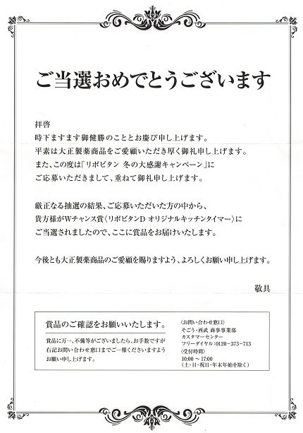 けふは、リポビタン「冬の大感謝キャンペーン」の当せん報告をしたいと思います。