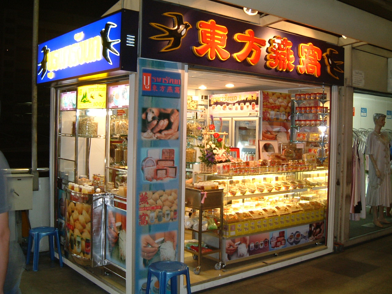 BTSは1999年12月に開通したスカイトレインと呼ばれる乗り物のことです。BTSの駅では、日本の駅売店キオスクに似た売店スペースで様々な商売をしています。ワタクシが見たことのあるショップでは、カフェ、すし、書店、CD、携帯売り場等々があり中には下着専門店まで、駅のスペースなので、かなりの集客があるので、さぞテナント料も高いんだろうなーーなどと思って歩いていると・・・なんと!ツバメの巣専門店! すかさず、一枚、二枚写真と撮らせていただきました~(ちゃんと許可は撮りましたが・・) 場所はBTSのナショナルスタジアム駅構内。切符の券売機の近くですから、場所はいいですよね~ ツバメの巣は乾燥したものから、ビン詰めタイプを販売しているそうです。聞くところによると他のBTSの駅でもツバメの巣専門店が出店しているとの事。近頃は中国系の女性だけではなく、キレイになりたいタイ女性や観光客も気軽に買っていくとか・・・ ここ数年ツバメの巣はぐ~んと身近になってきてますよ~上記のお店は2010年6月訪問の際には、閉店していました。しかし他の駅ではスコッチというブランドの専門店が次々に出店。購入している人をあまり見ないのですが、需要があるんでしょうね。日本でも下記の商品「美巣」が発売されました。いよいよ時代が追いついてきた感じがしています。M-Style Japan 楽天市場店食べる極上エステ!ツバメの巣で贅沢な時間を…。ヒアルロン酸・コラーゲン配合初回限定価格!お一人様3ケースまで。初回限定【送料無料】最高級天然アナツバメの巣“美巣”45ml(5本入)30%OFF[ツバメの巣 総合情報 WEB SITE]