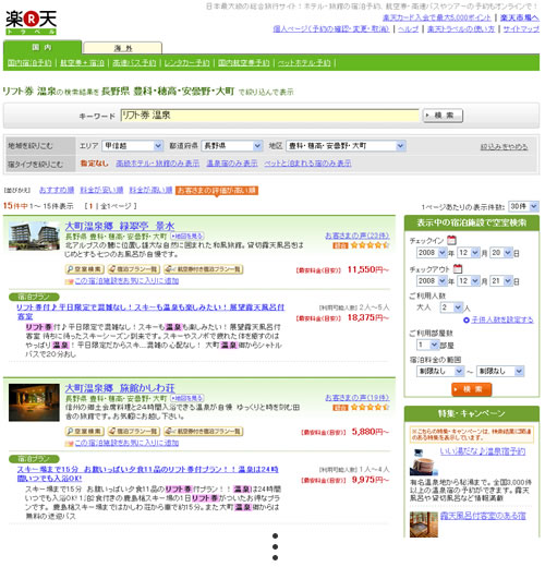 こんにちは!カテゴリプロデュースグループのハヤシリョウスケです。この度「キーワードから探す」に新機能絞り込みと並び替えが登場!--------------------------------キーワードで検索した結果を ■地域(エリア・都道府県・地区)や宿タイプ(高級・温泉宿・ペットと泊まれる宿)で絞り込んで ■料金が安い順・高い順やお客さまの評価が高い順に並び替えることができるようになりました。--------------------------------これにより、例えばタイトルのリフト券付きで温泉にも入れる長野県で評判の宿なんてこだわりの条件もStep1. キーワード「リフト券 温泉」で検索!Step2. 地域を「甲信越」-「長野県」、宿タイプを「温泉宿のみ表示」で絞り込み!Step3. 「お客さまの評価が高い順」で並び替え!・・・はい、どんっ※上記イメージは「地区」まで絞り込んでいます。格段に便利になったと思いませんか?むしろ今までご不便かけて申し訳ございませんでした「キーワードから探す」はこれからもぐいぐい進化を遂げていきます。ご活用下さい!