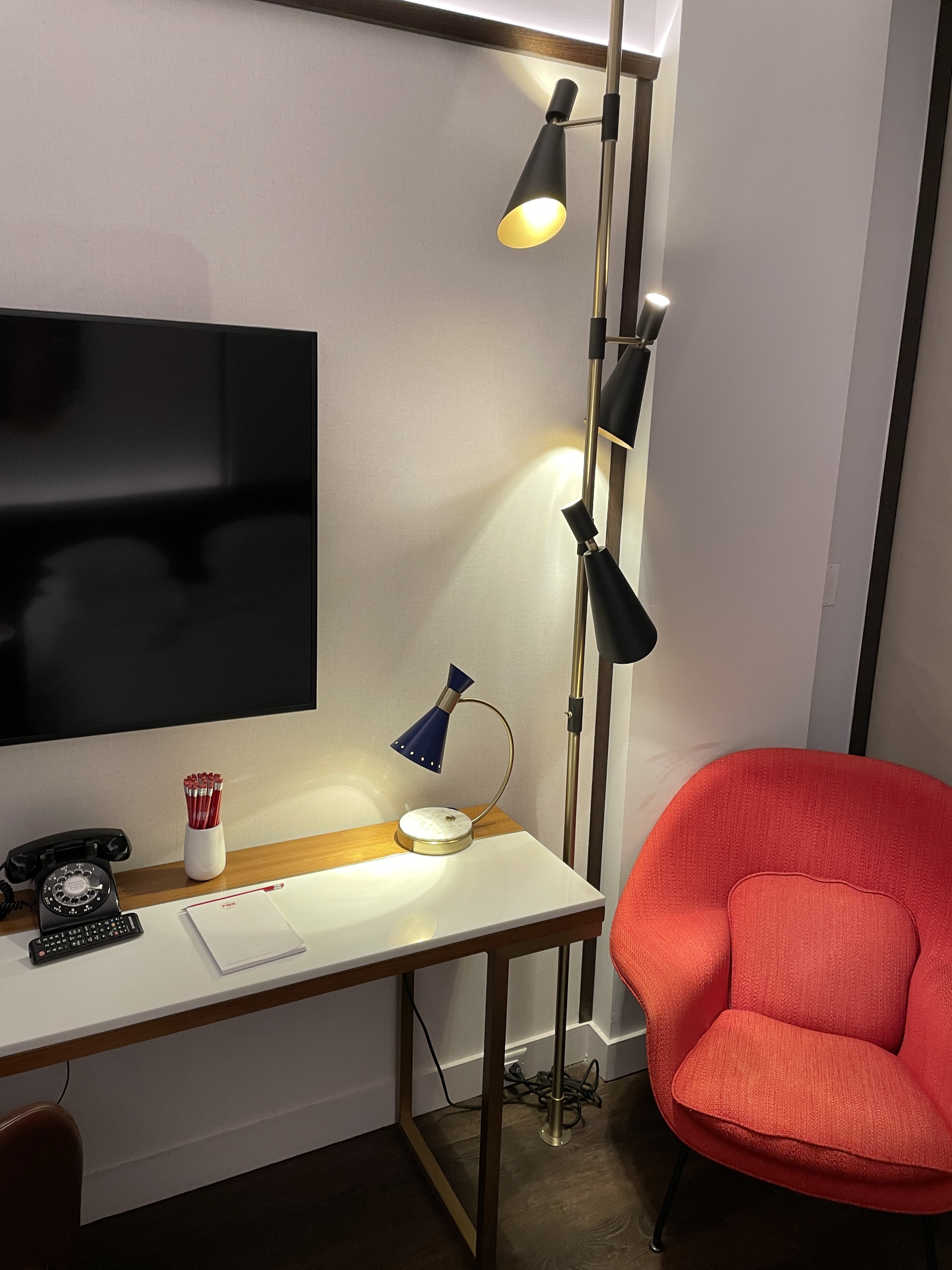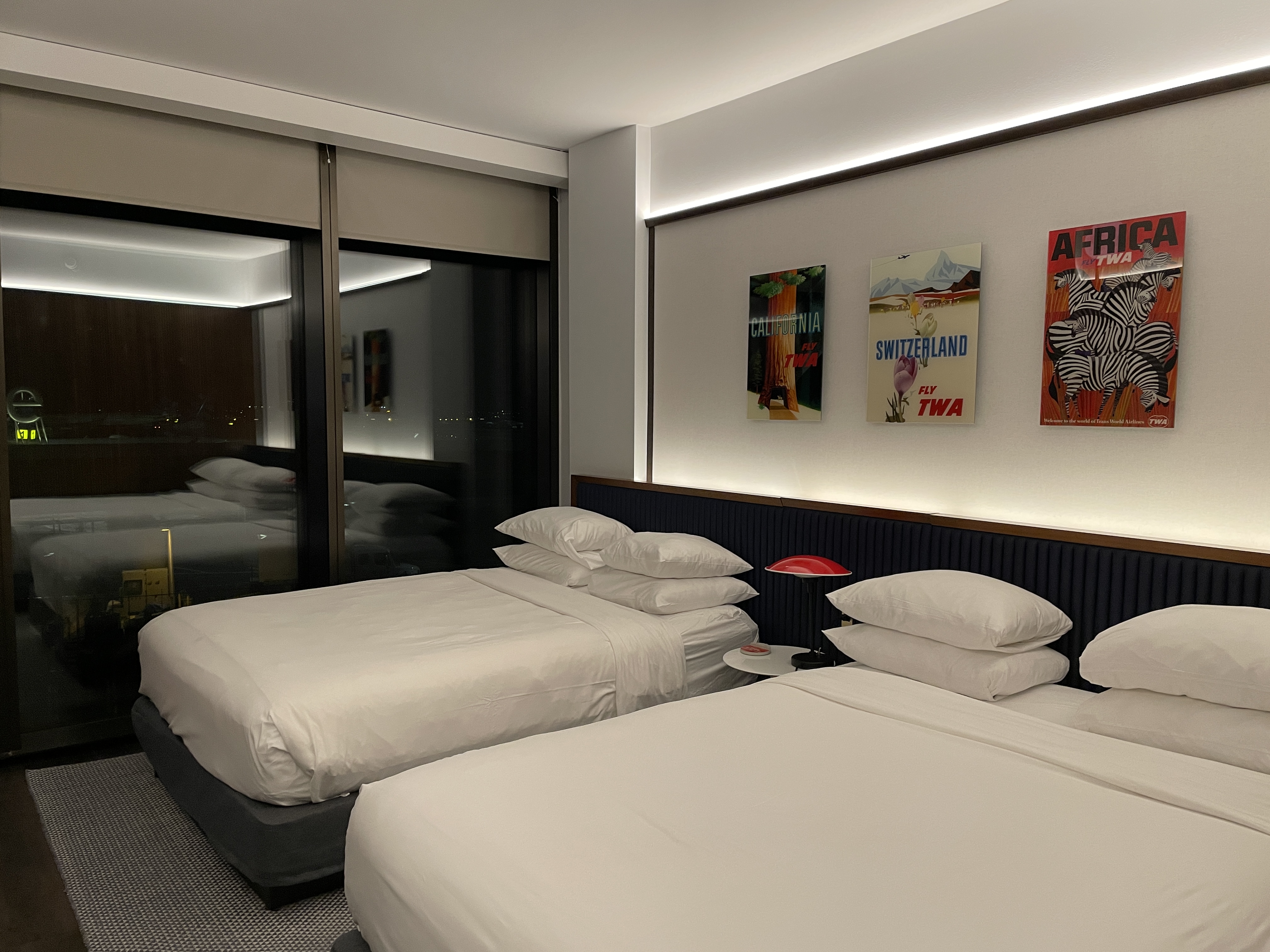 TWAホテルはフロントから客室までレッドカーペットが敷き詰められて、不思議な雰囲気。さっきまでの眠気も吹き飛ぶ😆😆😆