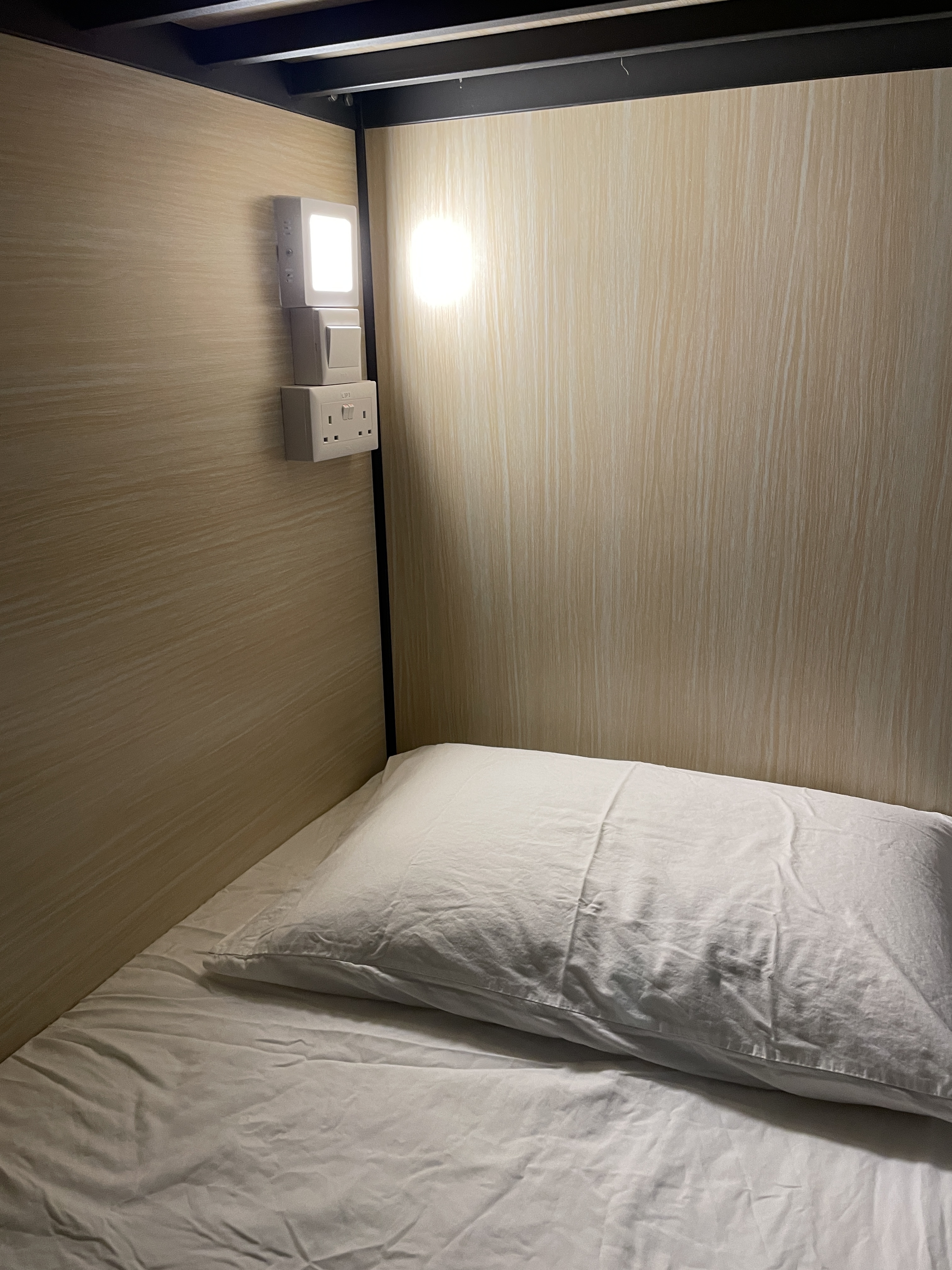 個室はベッドの頭側にライト。一応、ベッド下の引き出しに鍵がついててセキュリティボックスになってるけど、個室のカーテンの向こうなので誰かが開けようとしても全然わからないかも。