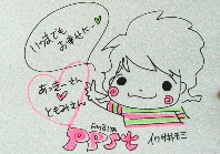 最近何かと話題のモチモチシューそのパッケージの絵をデザインしたFM大分のDJ岩崎朋美さん大分のカボスジュースのパッケージも描いてますその方から、婚約してからたまたまDJブースに呼ばれておめでとうのイラストを描いてもらう機会がありましたなんと同じ年齢。。。なのに若い。。。。すらすらっ~って描いてくれました可愛いイラストでしょ(゚ー゚☆キラッ テイクアウト