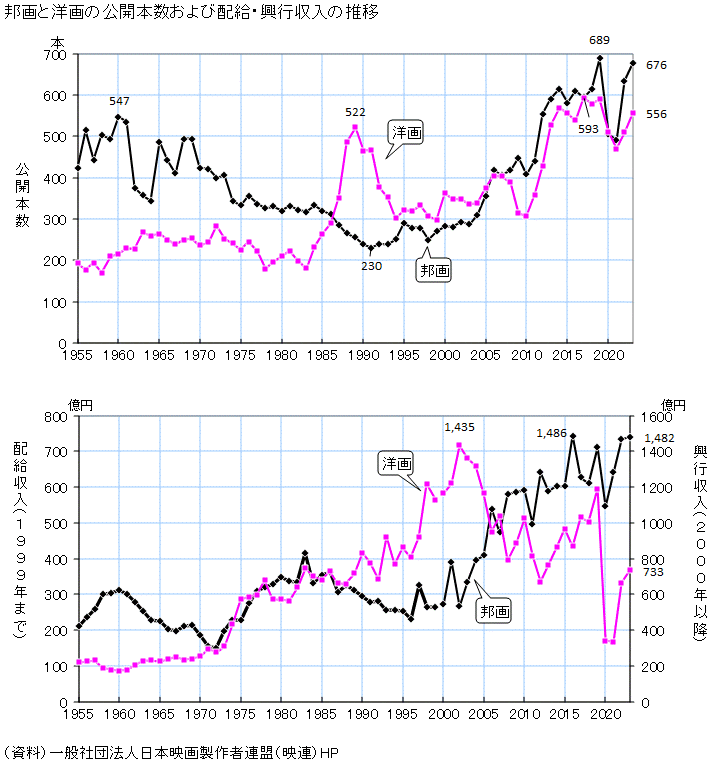 かつての日本映画低迷期、日本における邦画の興行収入は外国映画に大差をつけられていました。ところがアニメのヒット作のお陰もあって年々邦画人気が上昇、2024年には邦画興行収入は1,558億年で市場シェア約75%に対し、洋画は511億円でシェアは約25%(日本映画制作者連盟調べ)。若者の洋画離れがどんどん進み、いまでは洋画の3倍ほどの興行収入を日本映画はあげています。