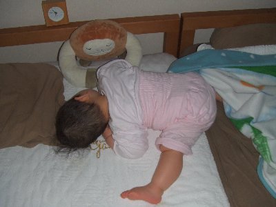 ハイハイはもうお手の物。そのハイハイの速さは新幹線並み。引き出しやロッカーの扉を開けているのを見つけると部屋の隅にいたはずの陽菜はビューとあっという間に目の前まですっ飛んでくるありさま。 いたずらしたい盛りの最近はテレビのリモコンはなめ尽くし、ベタベタ。コンポのボリュームはいじりたい放題。ただしこちらは音量が大きくなるとびっくりして自分ではどうしようも出来ずにママのもとにすっ飛んでくるかわいらしさも・・・ オムツやテッシュは袋から取り出してはバラマキ放題。外に連れ出せばバギーの上に立ち上がり、まるで暴走族の切り込み隊長のような姿に。そばを通りかかった小学生に「あの赤ちゃんなんだか変だぜ!!」なんて言われる始末 一体だれに似たのか一日中、昼寝もせずに動きっぱなし お陰で夜は一度寝ると朝まで起きない程、ぐっすりと寝てくれるのは大助かり。あれだけ動いてりゃ疲れるわなんて親のほうが疲れている感じ。 でも寝ている間もじっとはしていられないようで写真のごとくアクロバティックな姿勢を繰り返します。ふと気付くと180度回転していたり、僕の顔の上に足が乗ってくることもざらです。 陽菜よ。体操選手にでもなるか