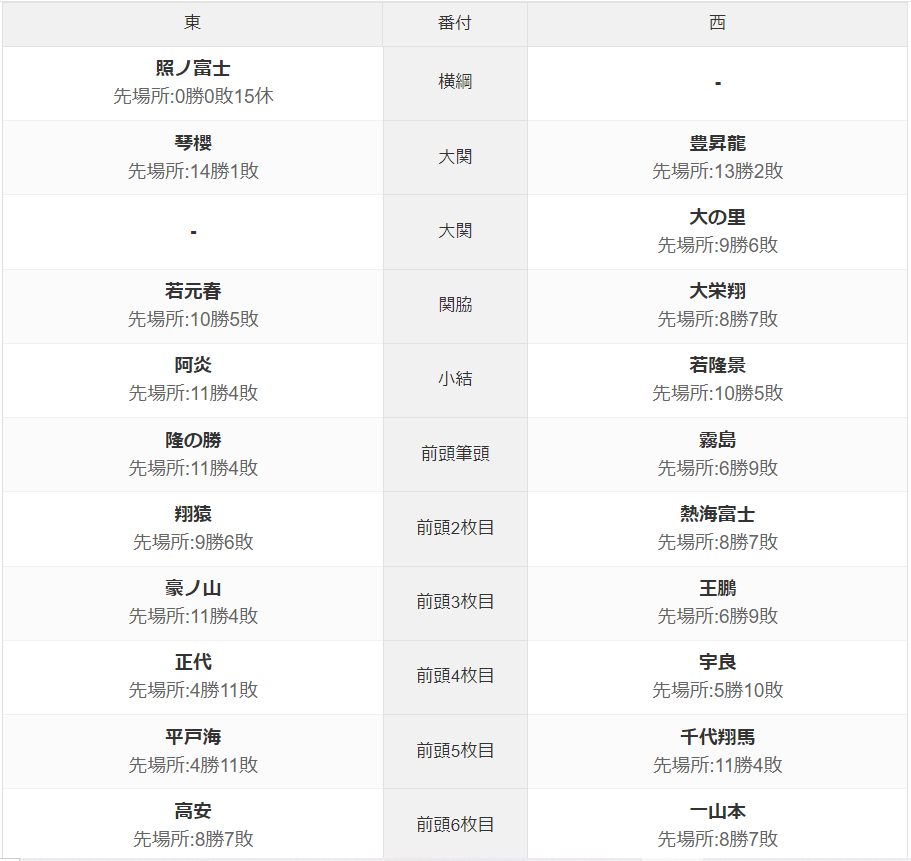 以前のようにまだ毎日の更新は出来ませんが、日曜日は更新すると自分に言い聞かせているのでやってまいりました。前回に予告した通り、今回は本日から始まる大相撲夏場所について書いていきますね。それを書いていくのに番付が必要だと思って、番付の画像を用意して保存したはずなんですけど、確認したら保存ができていません。調べたらパソコンで取り込んだ画像はダメのようで、このあとのモバプロ2レジェンドこれは保存が出来ていたので、スマホの画像をここに保存すれば使えるようです。ちょっと話がそれてしまいました、ここからは大相撲夏場所について書いていきます。大関から陥落して三役と呼ばれる小結に戻ってきた朝乃山、先場所110年ぶりに新入幕優勝と快挙の尊富士、共に今場所は休場です。横綱の照ノ富士は復活するのか、琴ノ若から祖父と同じ琴櫻に改名してどうなのか、優勝争いはどうなりますかねぇ。一番上のランクにやってきましたが、再び3回連続で3位になりましたね。特に1位の球団の勝率が10割、強かったですなぁ。全勝は初めて見ましたよ。このランクでは3位以上になったことがないですねぇ。メンバーは少しずつ変えてはいるんですけど、上には上がいるんですなぁ。まいりましたよ。では