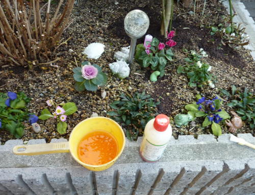 こんばんは暖かい日でした神戸に居るときゃ~♪暖房バッチリで忍の必要はなしぃ ~♪大阪じゃぁ~ 着込んでぇ寒いんだわぁ~♪ ってことで週末は雪の情報もありますが 週末は ダメなのだ。。。 土曜日にコレやっときました 石灰硫黄合剤一回目ですHTやFLは剪定前なので下の方だけです。。。 あと2回分くらいはありそうですが来年に回すかどうか? その後行ってきました歩いて。。。。 ベンツの家です ピエール君の施肥をしてなかったのでやりました鉢状の花壇なので土を少し出してからの施肥でした その後ピエール君にも石灰硫黄合剤を塗って終了! 今回行くとリスが増えていました元通りに戻してオシマイ・・・!春が楽しみ~! 少し楽しくなったようで階段にソーラーのライトなんかも置いてあった。。。。 花を育てるのが楽しくなることは良い事だ~! で 日曜日この日も氷のドレスはでていましたで新しいカメラで撮ってみた これが限界なのですこれ以上マクロにすると真っ黒にはならないけれどぼけぼけ~!なのです マクロでは無理となると面白く無いですね 近づくとぼけぼけ~なのですから。。。。。でぼけぼけ~と言えば 芝桜なにげにボケ咲きしております 弱っている部分に移植したりしてますがそれでもマ・バ・ラ 。。。もう少し暖かくなったら隙間も埋めていこう。。。 ふ~~~