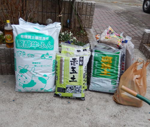 こんばんは朝はよく冷えてました昼以降は少し緩んだかな?それなら明日は雨なのか。。。 4日することが思いつかなかったので少し早いのですがすることないし先の予定が読めないのでやるとに!でホムセンへGO! 買ってきました 元肥の肥料と土肥料はいつもの牛糞・化成肥料・骨粉入り油かす・加里・過リン酸石灰etc土は赤玉の小粒を多め・バーミキュライトetc 開店と同時に店に入ってすぐに帰ってきて作業開始サシスセソ。。。 深めに掘って底に化成肥料etcを投入その上からは赤玉や牛糞を混ぜながら埋め戻す。。。 で 完了綺麗に均して表面にもバーミキュライトを撒いておきました 次の日起きてみると余った土を盛ったトコロや肥料をやったトコロは 早速鳥さんが寝床にしたのか穴ぼこがいっぱいでした 元肥を完了したので こぼれのスミレ類を移植しておきましたそして昨日嫁さんが種から育てた苗も移植したようですそのあたりはまたの紹介です で上の写真の右側のバラ根元には ベーサルになりそうなでっかく真っ赤なポチッ!ちょっとアラ早いわねぇ~!バラはローブアラフランセーズです ふ~~~