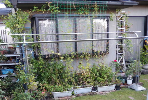 こんばんは 夜から雨でした 朝方雨は止んでたので、出かけようと思いましたが すぐ雨が降り出して、やがて本降りに。。。 なのでまつり見物はパスしました ちゅーわけで ことしのまつり行脚は終了です 後は写真整理をして、アップです。。。 土曜日の朝 庭に出てグリーンカーテンを眺める どう見てもショボかった今年のカーテン原因は分からないけど種だけ採取して終了しました白いルコウソウは採取出来なかったコボレで芽吹いてますがそれは無理でしょうね ってことでカーテンを撤去してバラの鉢を移動させておきました これで鉢置き場もグッと少なくなったなぁと思ったら 相変わらずでした別の所から持ってきた。。。 その後 まつり見物に出かけましたが気になることがあったので合間を見て帰ってきてやっつけた・・! 花の苗をポット上げ自分で蒔いた種は最後まで。。。ってことで 万歳ではありません少し高いトコロに置いてるので写真撮影のため、手を上げた。。。まだ芽吹いてくると思ってるのでまたこの作業は続くでしょう・・? コボレの状況をパチリッ! 白いデルフィのあったあたりですがすでに芽吹いてます枯れたら嫌なので一部ポットにも移動しておきました奥のクリローと朝霧草は根付いたかな・・? その後またまつり見物に出かけたのですがとっても良い天気だったので空も真っ青 ダリアも元気に咲いてました ブラックもそして 台風で倒れたダリアも開花何度起こせば済むのだろう。。。 玄関前では ブーゲンが咲いてます今年の冬は枯れないように家にいれておかなくちゃ。。。まつりが済んで一気に寒さが身に染みそうです夏の花も家に入れる準備を始めないと。。。バタバタしてるので間に合うのかなぁ・・? ふ~~~