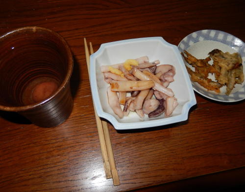 こんばんは 蒸し暑い雰囲気でしたが 午後、急に真っ暗になり雨 そして寒くなりました まだ衣替えしてないやん。。。 明日・明後日の朝は8度らしい。。。 金曜日の酎!のアテ イカの醤油炒めと梅昆布梅昆布は古くて色が変わってました 当然これだけでは足らず らっきょともろみそして自家製の540枚浸け!数えたので間違いない・・! 土曜日の朝 まだハイビスカスは咲いていたがっ! 家に持って入るために鉢上げを決行しました 移動中に花粉が飛んで キラキラ輝いてましたけど~咲いてるのも容赦無くほとんどカット 家に入れるためには仕方ないですね鉢上げ2本と元々鉢植えのは土を変えて終了ですがまだ家には入れてない明日は寒さで凍えるかも・・? 土曜日の酎!のアテ ニラ当然足らないので晩ご飯の残り 関東煮きを追加その後昼間にホムセンで買った 鮪のしぐれ煮のサイコロ半額になってました懐かしい味でした・・YO! 庭では ツワブキが咲き始め!話の流れには特に関係ありませんが。。。 ふ~~~