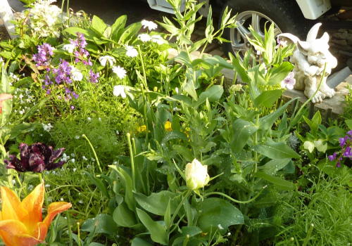 こんばんは雲が少し多くて丁度エエ感じの気温だった朝から夕方まで畑・庭でヘトヘト。。。庭のチューリップがほぼ終わりましたしばらくは葉っぱ状態で放置ですチューリップが無くなったのでゴイルは寂しそうに・・!三角座りで何考えとんだか。。。西側花壇ではクレマチスのマルチブルーが咲きました南側ではオステオが元気この横にハイビスカスを植えますが今はオステオが盛んなのでしばらく待ってみますちょっとだけ。。。中庭では水仙が終わりツツジが咲いてます西側でもツツジ・オステオ・オダマキなど。。。すぐ横では千鳥草が咲いてますこの横にはトレゾアがありますが咲くのはもう少し先だと思われます、、、南側ではバーバスが咲いて千鳥草がワンサカ中にはローズ大阪とブラックプリンスがありますが大阪はブラインド一杯でまだまだですムタビリスの下ではオダマキ種類は知らない。、、去年もブーケみたいに咲いて種を取るツモリだったけど忘れてた。。。アプローチでは斑入りのサギソウが出てきました去年はもうチョットで開花だったけど水切れだった。。。今年はちゃんと咲かせよう・・!なんで市の花ですからぁ・・!ちゅーわけでバラの廻りの花の話でしたえっ!?開花?してましたヨけど今度ね・・!明日は法事アルコールもでるので1日終了~~!おっ!朝一でメールしとかないと。。。じゃ