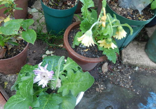 こんばんは週末は暑かった今日は奉仕作業の後庭や畑でヘトヘトその後呑んだのでヨッパで~~すってことて手短に。。。ホムセンで処分品のガーベラがあったなかなか苗では無い色なので買ってみた50円と100円だったけど黄色はダメみたいな感じついでにトケイソウも買ったポイントで買ったけど枯れてしまったので追加2つ入ってたけどイマイチな感じウチにはトケイソウは合わないのかも。。。バタバタと忙しい中グリーンカーテン用のプランターを出して種を植え付けておいた今年の夏はドウなんだろう。。。先週土曜日の酎!のアテエシャロットと納豆チーズと新玉葱のすったまねぎ大根の酢漬けの後だったので味はイマイチ新玉には向かないと。。。大風呂敷とか言う和菓子締めはアイスだった挿し木のダービーが咲いていた親株は調子悪いけど挿し木は咲く・・!カーテン用のプランターに水をやっていたらポンっ!朝顔の芽が出た・・!って事はないでしょうコボレで出ていたのを移植しておきましたじゃ