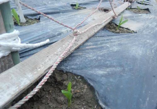 こんばんは夜中はまだ雨が降ってたけど朝には止んで快適な通勤だった庭も畑も潤ったでしょう。。。畑にて播いたトウモロコシが発芽しました撒き直したマルチの大根も大きくなってきましたが別なトコロの撒き直した大根はイマイチで再度撒き直しておきました発芽寸前で牛糞やらを上に乗せたので虫の影響も出たのかもしれません今回ダメなら今の分で我慢することにします。。。オクラも買ったのは枯れたけど種まきのは大きくなってきて本数が多い予感また地獄が始まりそう。。。収穫はほうれん草レタスキャベツ別な時に小松菜アナーキーほうれん草ラディッシュそしてカリフラワー少し色が変わってきてましたが湯がいてみると真っ白・・!とっても美しく美味しゅうございました去年の自然薯のムカゴがいっぱい発芽なので袋の畑へ移植長芋のあったところのムカゴも発芽してるので袋畑に入れてますトタンを下地にしたところのも芽が動き出しましたムカゴのがどれだけ大きくなるかは分からんけど自然薯地獄もありそうだそれはそれで元気になるでしょう。。。トマトも花が咲き始めてます花の下の脇芽を伸ばして2本仕立ての予定なので脇芽も取り始めました今年は雨に濡れないようにと寒冷紗で屋根を設置これなら音も少ないので住宅街でもOKけど~この前の風に揺られてフ~ラフ~ラ~ってことで穴が空いたり破れたり明日見に行ってみますが別な方法も考え無いとダメかもね。。。じゃ