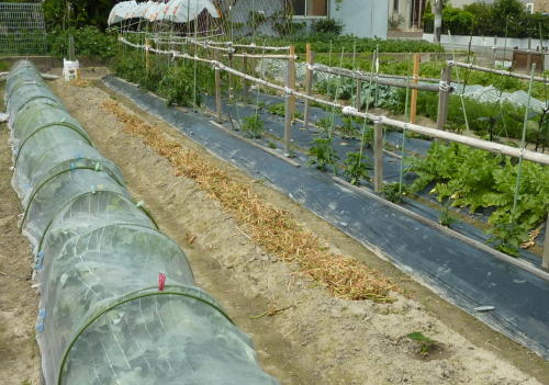 こんばんは天気が良くて暖かかった帰りの電車では帰省客もいっぱい明日からは5連休ですが2日は予定あり、法事とかですが。。。残りで土曜日が雨の予報すると明日山に行きたいが熊がなぁ・・!まだ行方知れず。。。畑にて買ってきたオクラの苗が霜で枯れてましたなので種まき分には帽子をかぶせた去年も同じような状態で種をかったのだった。。。里芋は少し動いてますがイマイチ5つほどは腐ってたので撤去したJAで食用を買おうと思ったけど売り切れだったので諦め移植して場所をズラしましたツル無しインゲン初めに播いたトコロは出そろって大きくなってきた日曜日茄子の支柱立て今年はちゃんと3本仕立てにしよう・・!トマトやピーマンにも支柱完了土曜日に種を播いたとこだけどJAで苗が安かったのでトウモロコシも買って植え付け完了後はカラスの勝手でしょ・・!最近はトマトの出来が悪いやはり屋根を掛けないと・・!ちゅーことでトンネル用のわっかで屋根の下地完了不織布を付ける予定ですビニールもありだけど雨が降ったらパラパラとウルサい住宅も近いので配慮した。。。イチゴが赤くなってきたので5粒収穫1日遅れで食べたけど美味しかったと思う。。。今年もイチゴ地獄はやってくるだろうか。。。隣はカリフラワーです遅めに播いたのが大きくなって収穫ですさて熊が居なくなったのを誓って酎!~~~するかじゃ