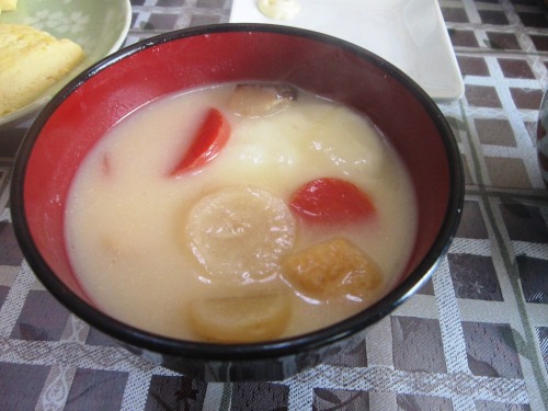 雑煮には地域性が出ます。実家の雑煮は,白味噌です。丸餅に京人参,大根,シイタケ,揚げが入ってます。横浜ではすまし汁のようです。関西はどこでもこんな感じなのかな。