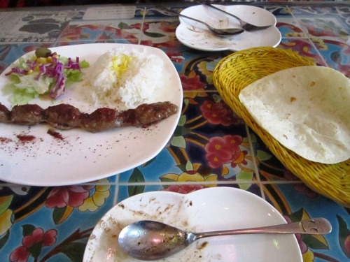 トルコ料理のお店サバラン@自由が丘へ。フェセンジュンというざくろとクルミを使った甘酸っぱいシチューのような料理をバスマティ米に絡めていただきました。鶏肉とわからないくらい肉がしっかり煮込んでありました。本日のランチはラム肉梅干しのように酸っぱいスパイスが肉の臭み消しでかかってました。パパド?やバスマティ米とともにいただきます。どこかで食べたことのある想像通りのラム肉の味でした。ランチタイム食後はチャイかコーヒーが出ます。チャイをチョイスなつめがつきました。餡子のような甘さでした。デザートはクーポンでトルコアイスを選択。スプーンが二つ付いていて,混ぜているとよく伸びます。口の中に入れると雪見だいふくを食べているような感じです。夜はベリーダンスショーもやっているそうで,宣伝も兼ねて店内のテレビで流してくれてました。