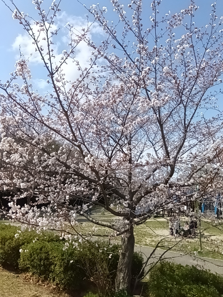 天白公園に花見へ。ところどころ見頃になった桜がありました。風が寒かったけど、お友だちと一緒に楽しく遊びました。