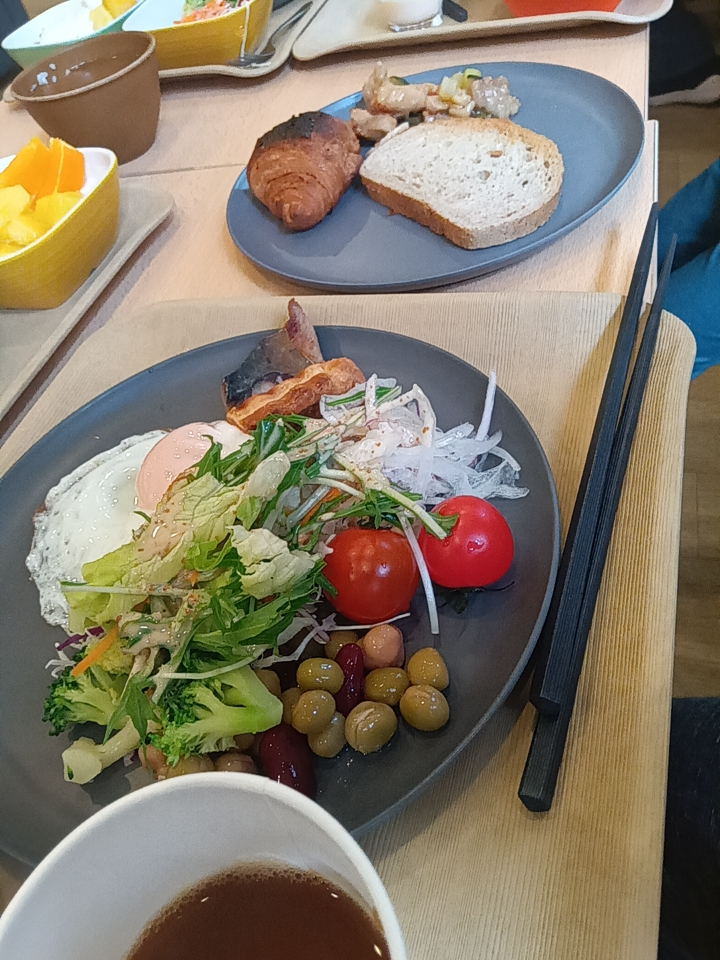 朝食のビュッフェ。ここが本当に種類が豊富でどれも美味しいので楽しみです。朝からたくさんいただきました。出発準備を整えて実家に向かいます。