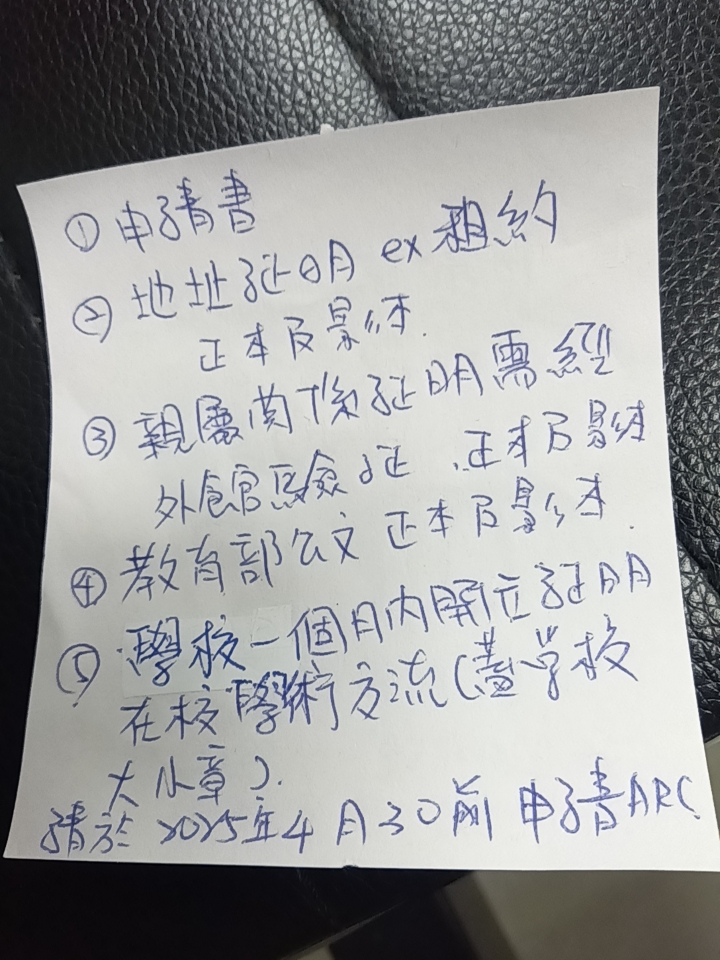 居留証(ARC)申請のために台北の移民署へ行きました。台中で門前払いされた件のリベンジです。受入大学の先生に追加書類をもって同行していただくために台北での申請になりました。当初は追加の証明写真を2枚用意すれば手元の書類だけで申請が可能と伝えられていました。他のブログで駐在員だったかの居留証申請で必要な書類は以下でした。①居留ビザ+コピー②パスポート+コピー③写真④関係証明文書⑤1000元⑥申請後10日間しての受け取り台中での申請では,以下の通り,特に5番目の大学の押印がある学術交流開始の証明書を直接もらう必要があるとのことで戸惑いました。先生が自分と同じ立場で受け入れた日本人の居留証申請の際には大学の押印は必要なかったようで,先生も戸惑ったようですがすぐに追加の押印をした原本を持参してくれました。待ち時間はかなりありましたが、その間にお互いの自己紹介や、研究に関するアドバイスなどもらえました。コピーしなければならない書類はあったものの、必要書類は全て揃っていたので、順調に完了しました。さらに現物を書留郵送する手配までしていただきました。発行は2週間後。予想より長かったですが、4月中には取得できそうです。