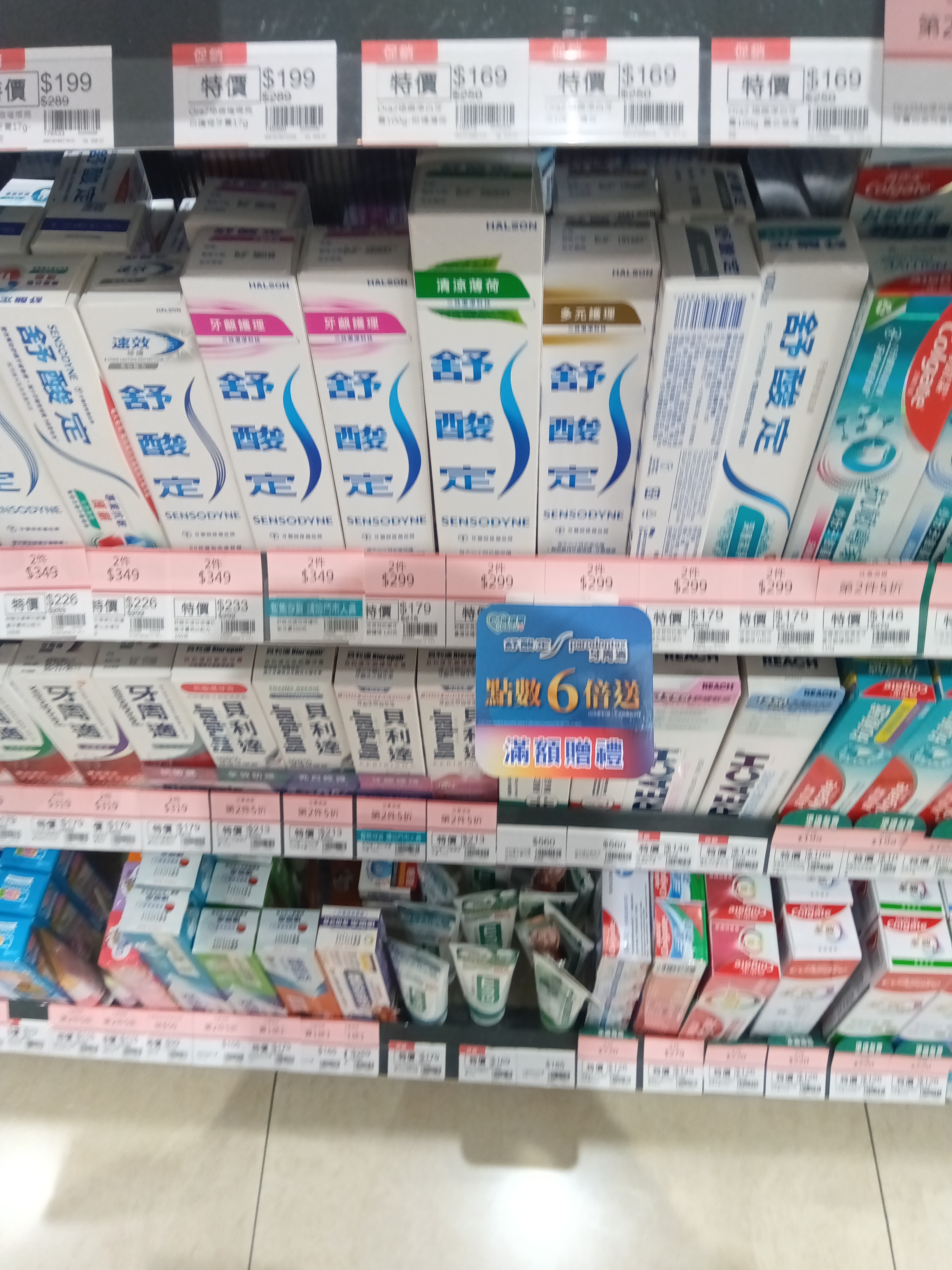 優先度は低いとみた歯磨き粉の替えを持ってきませんでした。シュミテクトコンプリートワンEXがお気に入りでしたが,日本だけで通用するブランド名でした。世界的にはSYNSODYNE,台湾では音あてで舒酸定と呼ばれています。同じ名前でも機能によってさまざまな種類が展開されてます。同じ種類でも店によって値段が大きく違います。ドラッグストアは意外に高いです。画像はWatons屈臣氏のラインナップ。スーパーが安かったりします。また3個や4個セットで買ったほうが当然お得です。小北百貨という雑貨屋さんで4個309元とかなりお得でした。いろんな店で下調べした甲斐があって,見かけたときは即買いでした。1カ月を過ぎて,どの店で何を買えばいいか分かってきました。
