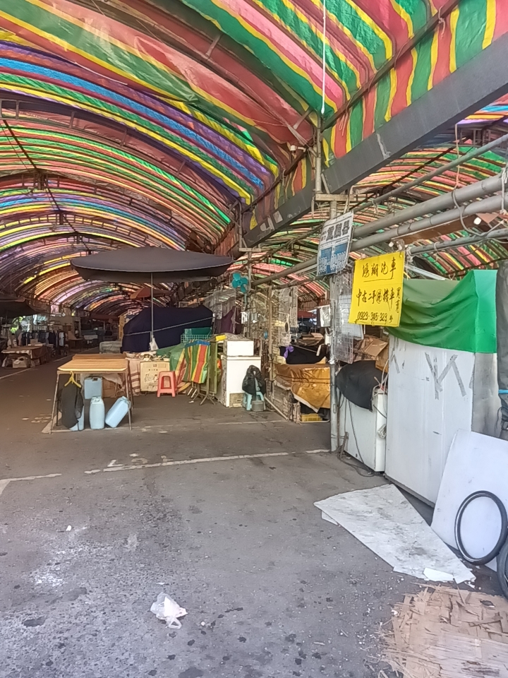 子どもを送ってからフリーマーケットへ行ってみました。午前7時から開いていると聞いていきましたが,ほとんどの店はまだ閉まった状態でした。調べ不足でした。でも工具類を売る店は開いていたり,手前の洋服屋で100元~のリサイクル品を販売していたりとそれなりに雰囲気はわかりました。テント張りの通路中ほどに富の神様が祀られていました。2年前に火災にあったものの,再興したようです。休日はたくさんの人出で店も多く開いているようなのでいつか再訪したいです。