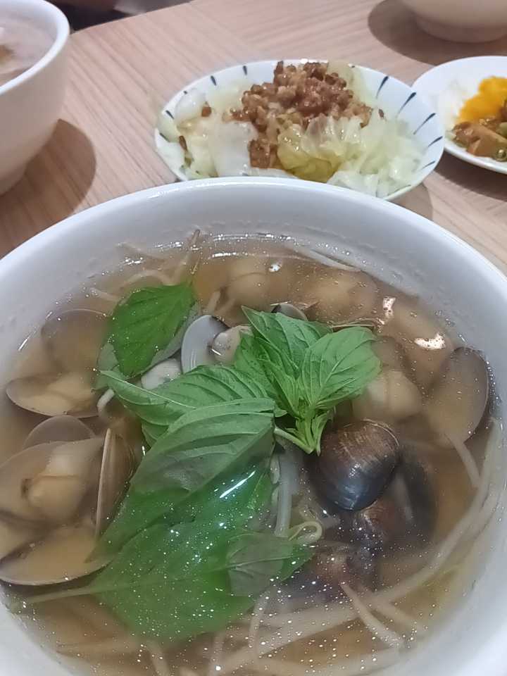 休日の夜は高確率でラーメン🍜子供を連れた家族でいっぱいでした。初めて ハマグリのラーメンを頼んでみました。あっさりして美味しかったです。香草のインパクト大です。副菜として蒸しキャベツなど