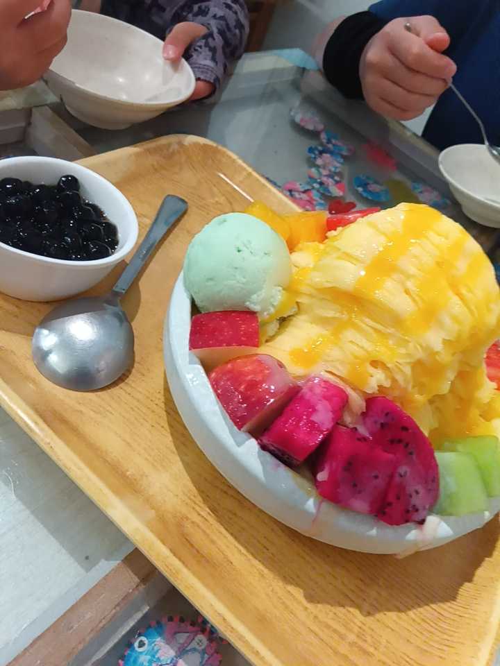 連日のかき氷屋さんでした。プールで泳いだ後 暑かったのでそのまま かき氷屋さんへ直行しました。店員さんにもすっかり覚えられていました。前回と同じ マンゴーかき氷にしましたが サービスでタピオカをつけてくれました。店員さんと仲良くなるといいことあります。