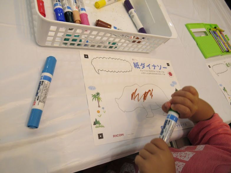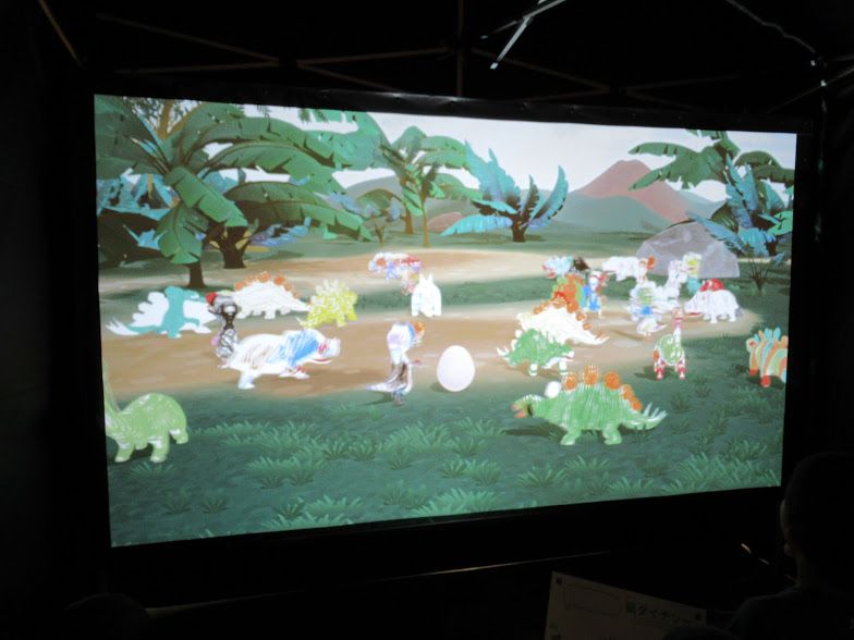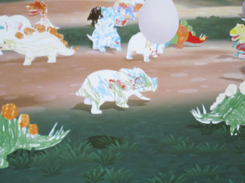 好きな恐竜の型枠の中を塗って,シアター内の装置でスキャンすると動いてくれます。