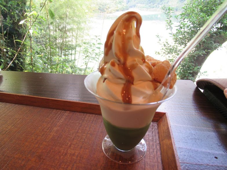 抹茶プリンとクリームの上にきな粉のわらび餅とソフトクリームです。