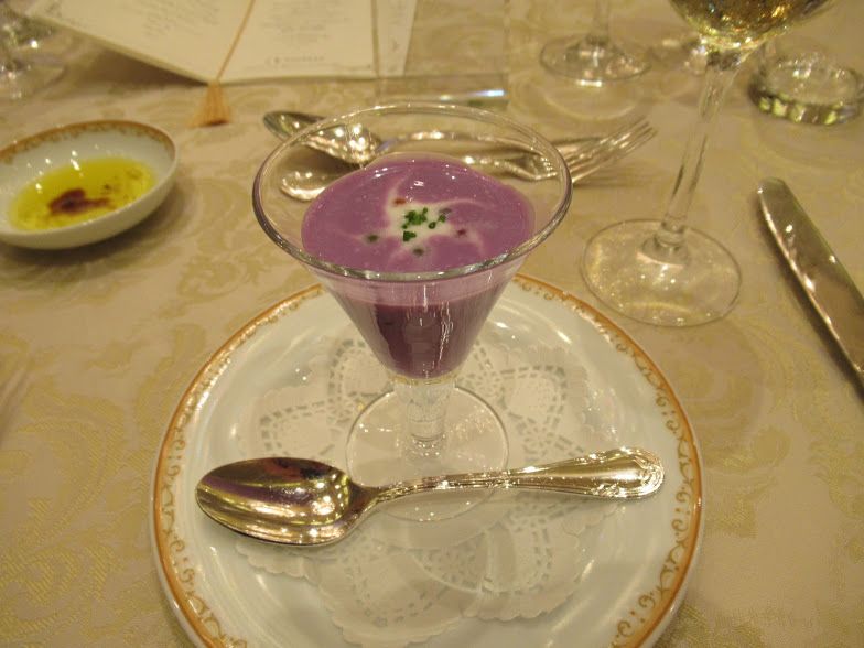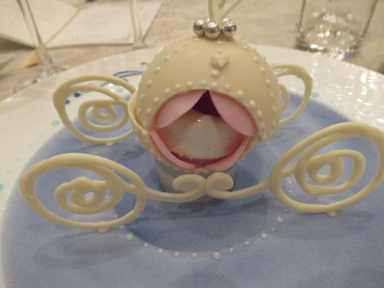 最後のデザートはホワイトチョコの馬車の中にラズベリーソースのケーキが入っていました。