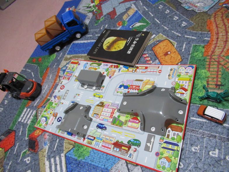 今年のサンタからのプレゼントはトラック・フォークリフトセット。トミカ道路マップ,カニクレーンとハスラートミカ,図鑑です。