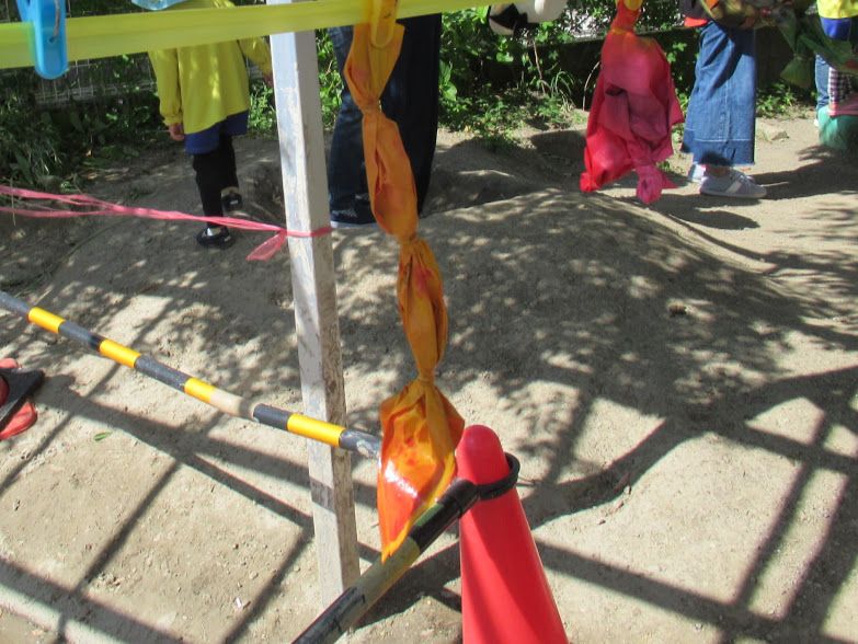 最初にこいのぼりの形をした紙を自由に輪ゴムで縛って,好きな色を付けていきます。