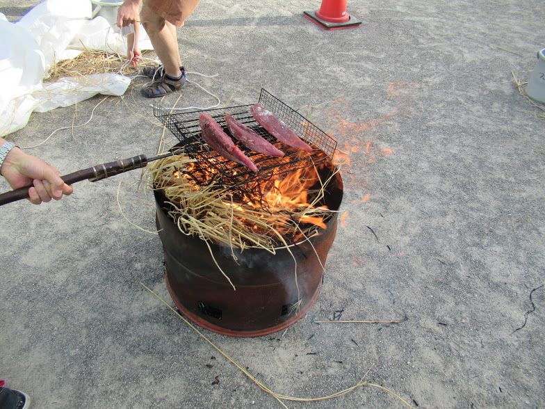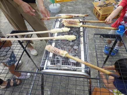 棒にきりたんぽのようにパン生地を巻き付けて炭で焼きます。