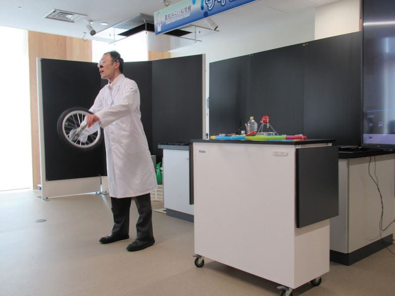 回転パワーでは,遠心力やジャイロ効果の不思議をいろんな道具を使って実験してくれました。