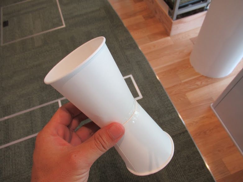紙コップ2つの底同士を張り合わせて,輪ゴムを巻いて飛ばします。