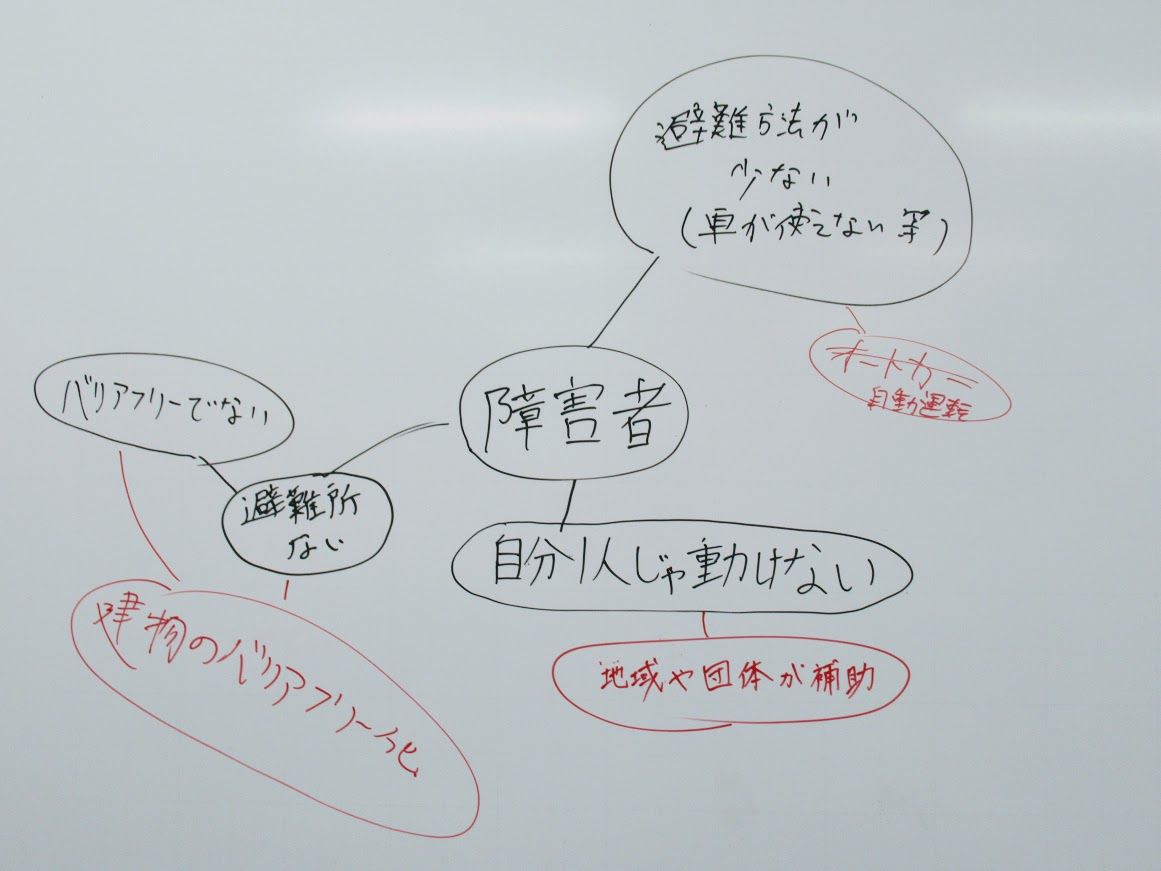 この日はハートネットTVで放送された災害弱者の映像を見ながら,ウェビングの手法を使って,問題の構造や課題解決について考えてもらいました。