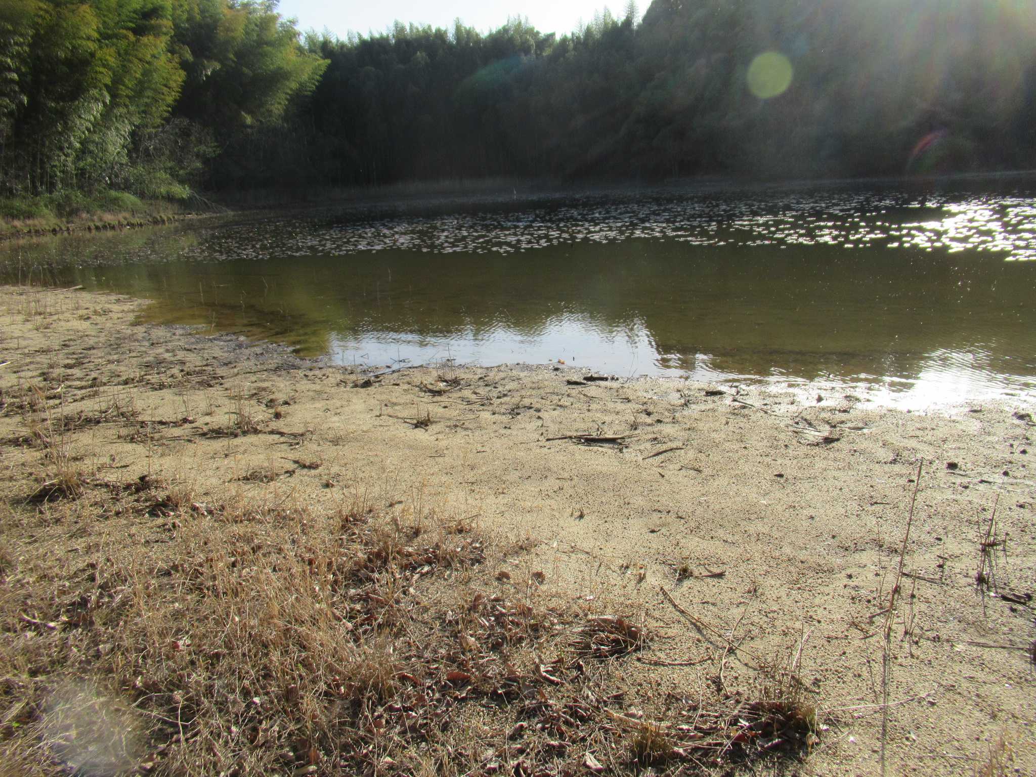 今は水が少ないですが,満水時との水位変動による陸地と水面の境目が生物多様性を生み出すようです。