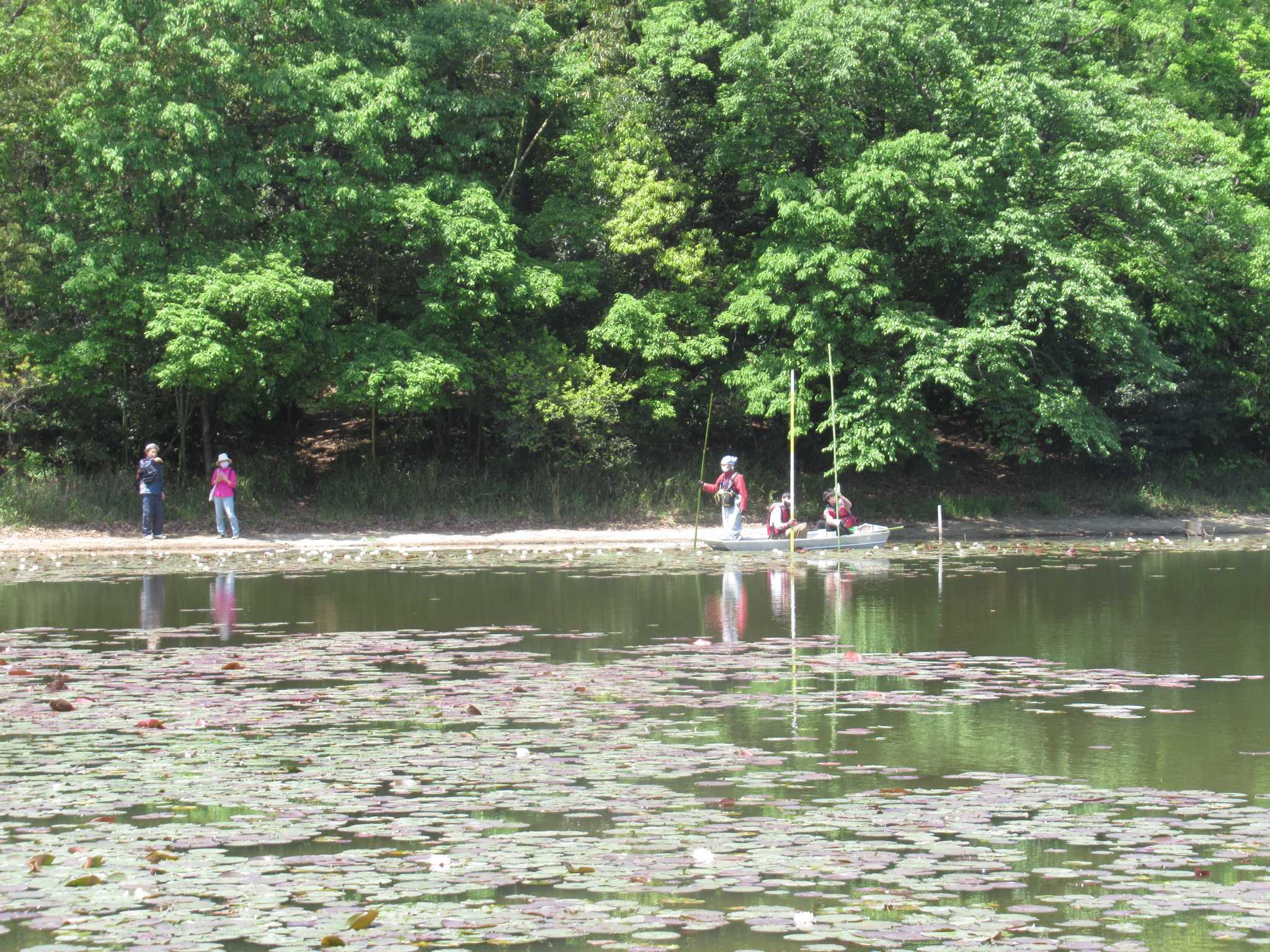 スイレンの咲いている部分を中心に水深を測っていきます。