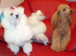 昨日、友達の家に寄ったのですが、入るなりすごいものを発見してしまいました。思わずシャッターチャンスを逃すまいと写真を撮ろうとするのですが、素早い動きで写真がなかなか撮れません。ようやく友達の協力を得てなんとか撮影する事が出来ました。 巨大な毛の生えたカブトムシのようにも見えます(@△@))怪しき生物!!!! 友達はトリマーさんなんですがこの生物は 彼女が飼っているモデル用のトイ・プードルなんです。本当は私の好きなカンナちゃんのおしりを撮影したかったのですが 恥ずかしがって撮影させてくれませんでした。コンテスト以外では撮らせてくれないのでしょうね(^^; ようやく撮れたのが、アヒル?アビル?ちゃんだったかこの子は落ち着き無くじっとしていなんです。それで怪しきポーズで撮れたんです。(#^o^#) 勢揃いで撮影しようと思っても暴れております。 左:カンナ/中:怪しき生物/右の子は今年子供を生ませるらしいです。