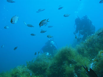 またまた佐渡ダイビングに行ってきました。前日まで雨でしたが当日は晴れのち曇りです。今回のポイントは高瀬の黒島と長手岬。1本目 黒島水温25.8℃/透明度10~15m/MAX.17.4m/潜水時間52分外海に面しているためブリやヒラマサなどの回遊魚に出会う確率があるということでしたが残念な事に小さな魚ばかりで少し大きいといったら真鯛が1匹…昨日の雨のせいか透明度はいまいちでした。それでも泳いでいるとイシダイの子供が寄ってきます。付いてきます。…いたぁ!!耳を噛まれました。好奇心旺盛でいたずら好きです。2本目 長手岬水温26.4℃/透明度10m/MAX.20.4m/潜水時間46分黒島よりも透明度はよくありませんでしたがここは小さな魚が群れていました。こんな感じです。 昼食はお弁当とサザエのバーベキューごちそうさまでした。そして夜のお宿はみなみ旅館という温泉宿です。もちろん新鮮な魚料理ですから満足できました。