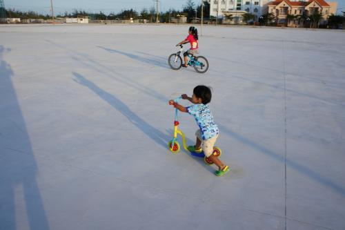 旧正月前に家の近くで重機が入って、マーケット広場が作られていました。旅行から帰ってくると、200m四方くらいのひろ~~~いコンクリートの打ちっぱなしスペースが現れていました。なので・・・出動します!!それから1週間、とおちゃんが会社の人から借りてきて・・・スケボーをはじめました。花も久しぶりのインラインスケート。足の筋肉がついたのか、ずいぶん上手に滑れるようになりました。夜になると、人もいないのに大音量で音楽をかけて、何をしたいのかさっぱりわからない広場ですが・・・我が家にはいい運動になります。インラインスケートもスケボーもここブンタウでは、かなり珍しいものなので、ものすごく見られます。そもそも、こんな暑いのに外を走り回っているのも珍しいかな。ますます日に焼けて、国籍不明になっていく一家です。