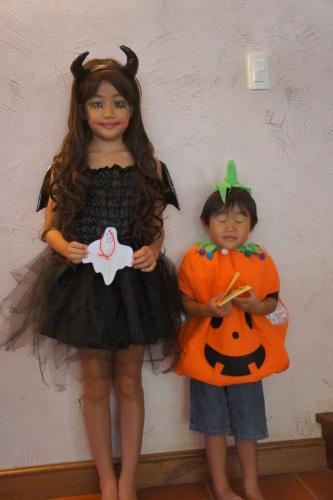 今日は学校のハロウィンパーティ。久しぶりのコスプレに花は大喜び。花は細いので、いつまでも同じドレスが着れる・・・丈は短くなったけど、幼稚園のパーティでも着てたような^^;。みのはコスチュームがないので、Tシャツにかぼちゃを貼り付けて、マントを・・・まあ、それを見れば花もマントが欲しいよねえ~~。ってことで、1mほどの布を6:4くらいの割合で切って、ふちを縫って、紐をとおして、おそろいの完成。帽子はお友達がホーチミンで買って来てくれてたので、助かりました。シンガポールの幼稚園と違い、朝から着て行って、丸一日遊ぶわけではないので、大荷物を抱えていくことに・・・。写真は帰ってきてからもう一度着てもらいました。朝からこれを着て行くんだったら、もっと大騒ぎで大変だったかな。お姉ちゃん大好きみのちゃんが「ドレスがいい~~~」ってごねるのも目に浮かびます><。ちなみに、このTシャツは「アンパンマンみたいね~」とおだてて着せたので、アンパンチのポーズ・・・。実際のところ、花はかなり気合が入っていたようで・・・小学2年生といえば、そろそろ年齢的にもコスプレが恥ずかしくなってくるのではないかと思うのですが、どうかしら??