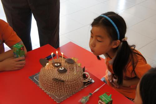 さて、本日花ちゃんが8歳になりましたお友達を呼んで、お誕生会をしたいというのですが・・・家でするよりは・・・。で、学校のスナックタイムにさせてもらいました。日本では考えられないけど・・・。ブンタウで一番おいしいと言われるケーキ屋さんで作ってもらいました。・・・パンダっぽいですが、「くまさん」です。味は、まあ、そこそこ^^;。ママが面倒だなあって拒否。そしたら、とおちゃんに泣きついてお願いしたので、本日は半休とってとおちゃんも同行。・・・親ばか??ばか親??微妙なところです。さすがに小学生になれば、学校でお祝いする子も減ってきますが、手慣れているので自分たちでいろいろやっています。ケーキより駄菓子のほうが人気で、「まだある?」と言われました。多めには用意していましたが・・・しっかりしていますね。みのが月曜日からお腹の調子が悪かったので、2日間休ませて、パーティには連れていったんです。同じ建物の中に小学校と幼稚園があるので、先生もお友達も「みの、みの」と寄って来てくれます。そして、ふと気がつくといない。みんなと一緒にトイレタイム。我に返って、「ママ~~」と泣いてみる。しばらく抱っこしていたけど、気がつくとまたいない。みんなと一緒におやつタイム。自分の分を食べ終わると、今度は戻ってきました。今日は花も一緒に帰るというので、じゃあ帰るか、となったところで、またいない。みんなとお教室でレッスン。いやいや、先生も今日休んでるんだから連れていくなよ^^;。仲良しだというタイレン(?)という男の子がしつこく「明日は来る?」と聞いてずっと手を握っています。予期せず、みのちゃんの幼稚園生活も見ることができました。ちょうど日本から荷物も届いたので、いいお誕生日になりました^^。さて、とおちゃん。あなたの子供は二人です。11月にはもう一度半休をとって、幼稚園でお祝いしてあげてくださいね。