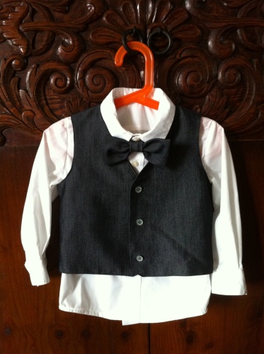 前回、みののイースターのコンサート用にベストと黒パンツを作った。そのとき、ふと他の子を見ると・・・みんな長袖シャツを着ていた。みのは家にあった半袖白ポロシャツだった。特に何も言われなかったから、とりあえずスルーしておきました^^;。さて、7月にはイヤーエンドコンサート。みののコスチュームはイースターから転用。蝶ネクタイが赤→黒になるということ。しまった・・・まさかあの衣装を転用することになるとは・・・。「今回はみのも長袖シャツ買うかな」と思って探すけど、ベストとセットになっているものか半袖ばかり。なんとなく時間を持て余し、ちょっと調子に乗ってきているので、やっちゃう??とおちゃんの冠婚葬祭用の白Yシャツを転用。肩とか襟とかよがんでるけど、ベスト着て、ステージ下から見る分には無問題!!あとこれにシルクハットがいるので・・・厚紙と布でやってみるかな。