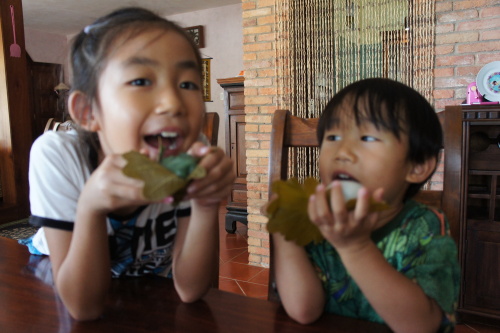 先週、とおちゃんが「まんじゅう食べたいなあ~~」と言いました。シンガポールならそれっぽいものが手に入るのですが、ベトナム・・・まして、ホーチミンからも遠く離れたこの地ではねえ。鯛焼しようと思って、あんこはシンガポールで仕入れて来てるけど・・・。ここしばらく、花が体調を崩しています。咳きも止まらず、あの大食い花ちゃんの体重が減ってしまうほど食欲が落ちていました。ちょっと小顔になっています!!さすがに「気力で治せ」と言っても、学校があるのでなかなか難しい。金曜日にはるばるホーチミンの病院へ。見た目は本当に元気そうで、先生も「う~~~ん・・・」と遠くからやって来た母娘に言いにくそうに、「元気そうだねえ・・・」みたいな調子。念のためレントゲンを撮ると、微妙に白い影が見えるような見えないような??抗生物質と咳止めをもらうことができました。もともと体力があるのだから、食欲さえ戻れば、体力も回復すると思うのですが・・・。咳が出ると、眠りが浅くなるせいもあるか。さすがにお昼寝してくれないし^^;。で、せっかくホーチミンまで行ったので、とおちゃんリクエストのために「白玉粉」を購入。ネットでレシピを探して・・・「まんじゅう??大福??」と尋ねると、「大福」と返事。ないのなら、自力で作ってみよう。和菓子は初挑戦でしたが、意外と作れるものだったのね。甘い物好きのとおちゃんとみのは大喜びで奪い合っていました。・・・花は食欲がないというより、あまり興味がない様子。まあ、食べ手が二人になったので、作り甲斐は出てきたかな。