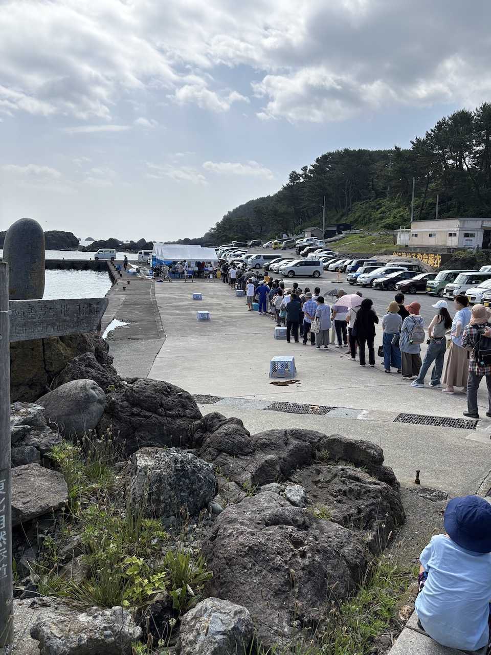 青森県八戸市深久保漁港です朝9時からウニ・ホヤ即売会8時40分でこの大行列ほとんどの方はウニ目当て買えるかな?暑い❣️なかなか前に進まないえ⁉️途中でウニが無くなったって船で漁師が採りに行くという約30分して船が戻ってきたよ販売再開‼️順番が近づいてなんとか買えそうだキタムラサキウニ1キロ2400円2キロ4800円1時間待ちでゲット!家に帰ってきみちゃんと殻剥き作業開始2キロで18個だった殻を半分に割るスプーンピンセット身を丁寧に丁寧に取り出す1時間かけて作業終了夕食は生ウニ丼WAOウニ美味すぎる‼️殻ウニ2キロで...生ウニ丼5杯はできるね