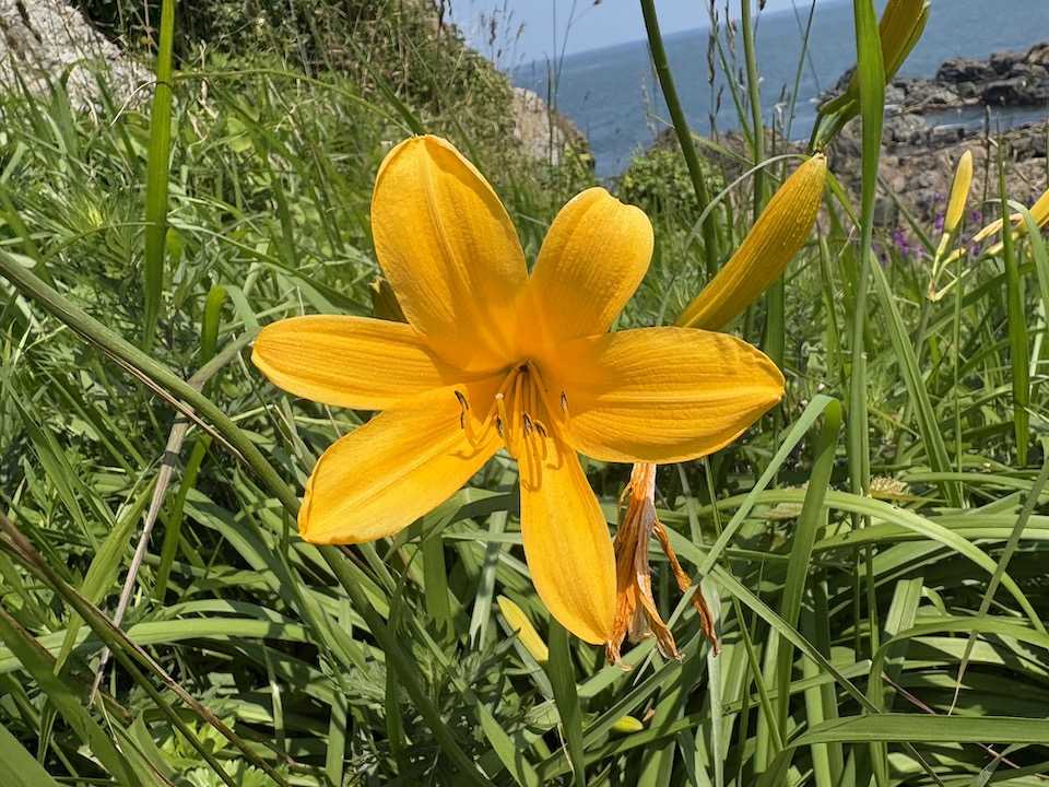 八戸の種差海岸では今ニッコウキスゲが咲いてますニッコウキスゲ=日光黄菅午前中に花が咲き夕方にはしぼんでしまう1日だけの命ですって明るくだいだい色の花その儚くも潔いところに癒されています花言葉は「日々新しく」太平洋の海岸美とニッコウキスゲから元気もらいました